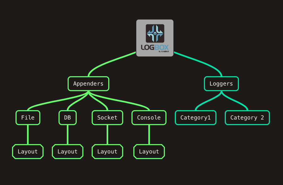 These components work in unison to deliver messages' logging and tracing and control how they are logged. You will primarily interact with the Logger component as it will send your statements to the Appenders you have configured. Users can extend LogBox and build custom appenders and layouts.